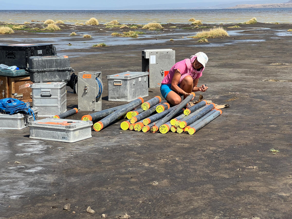 Elles sont complétées par des échantillons plus petits, prélevés par deux chercheurs djiboutiens. La mission Nilafar est en effet menée en collaboration avec l’Observatoire régional de recherche sur l’environnement et le climat, situé à Djibouti. L’équipe djiboutienne réalise trois carottes d’un mètre de profondeur entre la plateforme de carottage et le rivage, qui raconteront l’histoire plus récente du climat. Elle en profite pour mesurer la température, la salinité et le pH de l’eau, qui est très alcaline. Elle utilise aussi un filet à plancton, afin de décrire les organismes vivant dans un lac en apparence aussi inhospitalier.