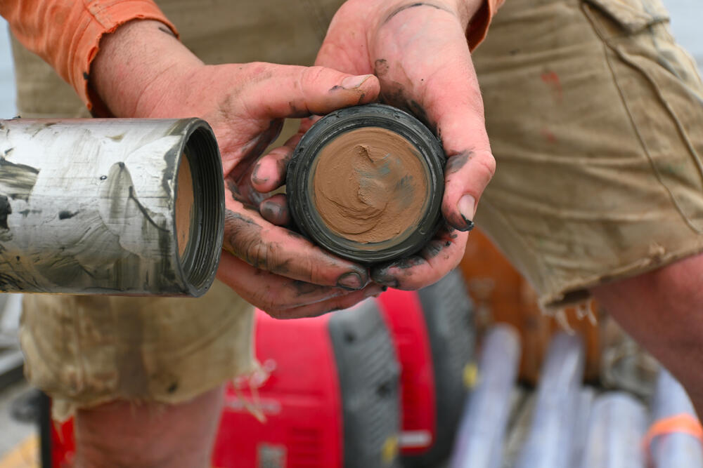 Dès le lendemain, la plateforme de forage, une barge motorisée de 4 mètres sur 4, est fixée au fond du lac par 4 ancres – une à chaque angle de la plateforme. Elle est équipée d’un portique et d’un carottier qui permettra d’extraire les échantillons convoités par les scientifiques : des carottes de sédiments de 2 et 3 mètres de long. Il est impossible, techniquement, de prélever en une seule fois une carotte sédimentaire de plus de dix mètres. Il faudra donc répéter l’opération plusieurs fois, jusqu’à atteindre l’épaisseur de sédiments espérée.