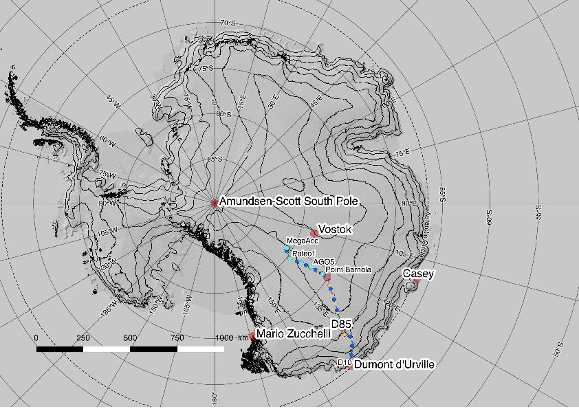 Cette caravane de véhicules terrestres (tracteurs à chenille, traineaux, caravanes vie et énergie, dameuse), mise à disposition par l’Institut Polaire Français et le Programme National de Recherche Polaire Italien, a parcouru un total de 3650 km (en comptant la montée des véhicules de la côte à Concordia) et véhiculé en tout une quinzaine de personne (scientifiques, docteur, mécaniciens, logisticien) sur 70 jours, en total autonomie. Au menu ce n’est pas loin de 1000 m de carotte de glace répartis sur 5 sites qui ont été collectés, deux stations neige, 2 stations météo permanentes, 5 stations sismiques et GPS déployées, la mesure en continu des isotopes de l’eau de l’atmosphère, la collecte et la mesure de l’aérosol atmosphérique, la caractérisation de la neige de surface (albedo, densité, surface spécifique, chimie) déterminée et des profils radar de l’empilement des couches de neige de surface acquis sur tout le parcours. Sans difficulté technique et mécanique majeure, le raid a pu faire le plein de données au-delà du programme fixé initialement. Ne reste plus qu’à mettre en musique tout cette base de données et répondre aux questions scientifiques ce qui prendra au minimum un an avant d’avoir les premiers résultats concrets.
