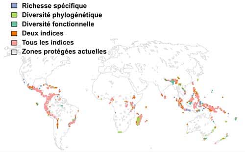 Alors que la biodiversité est généralement évaluée par le nombre d’espèces présentes dans une zone donnée, les chercheurs ont croisé ce critère avec deux autres composants, peu utilisés jusqu’ici : la diversité phylogénétique, qui reflète l’histoire évolutive accumulée par un assemblage d’espèces, et la diversité fonctionnelle, qui reflète la diversité de traits d’histoire de vie d’une communauté d’espèces (le type et le mode de nourrissage, la période d’activité ou encore la masse). Les chercheurs ont pu identifier des zones de protection prioritaires localisées principalement à Madagascar, dans l’Asie du Sud-Est ou dans les Andes grâce à des algorithmes d’optimisation spatiale. De ces résultats, ils ont pu évaluer l’impact d’une augmentation de 5 % des espaces protégés sur plusieurs espèces sentinelles. Si on maximisait la protection de la diversité phylogénétique ou fonctionnelle, cela suffirait à tripler l’ensemble des espèces et les différents composants de la biodiversité. En protégeant les espèces rares les plus concernées par les trois facettes, c’est une biodiversité beaucoup plus riche qui pourrait être sauvegardée aux échelles locale et globale. Au total, ce sont environ 1500 espèces d’oiseaux qui pourraient être préservés. Ces résultats sont publiés dans Nature.