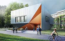 « Le projet architectural se compose d’un seul volume lisse et traduit l’idée d’un cristal posé dans un écrin de verdure. » Le travail de composition des 7 façades du nouveau bâtiment participe à son intégration urbaine et paysagère et lui assure une identité propre et rayonnante au sein du campus universitaire.