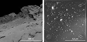Crédits photos : à gauche ESA /Rosetta /MPS for OSIRIS Team MPS /UPD / LAM / IAA / SSO / INTA / UPM / DASP /IDA, à droite : ESA /Rosetta / MPS for COSIMA Team MPS / CSNSM / UNIBW / TUORLA / IWF / IAS / ESA / BUW / MPE / LPC2E / LCM / FMI / UTU / LISA / UOFC / vH&S.