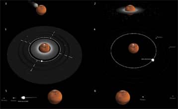 Sous l’effet des marées soulevées par Mars, la grosse lune retombe sur la planète en quelques millions d’années (5), tandis que Phobos et Deimos, moins massifs, rejoignent leur position actuelle dans les milliards d’années qui suivent (6). © Antony Trinh / Observatoire Royal de Belgique