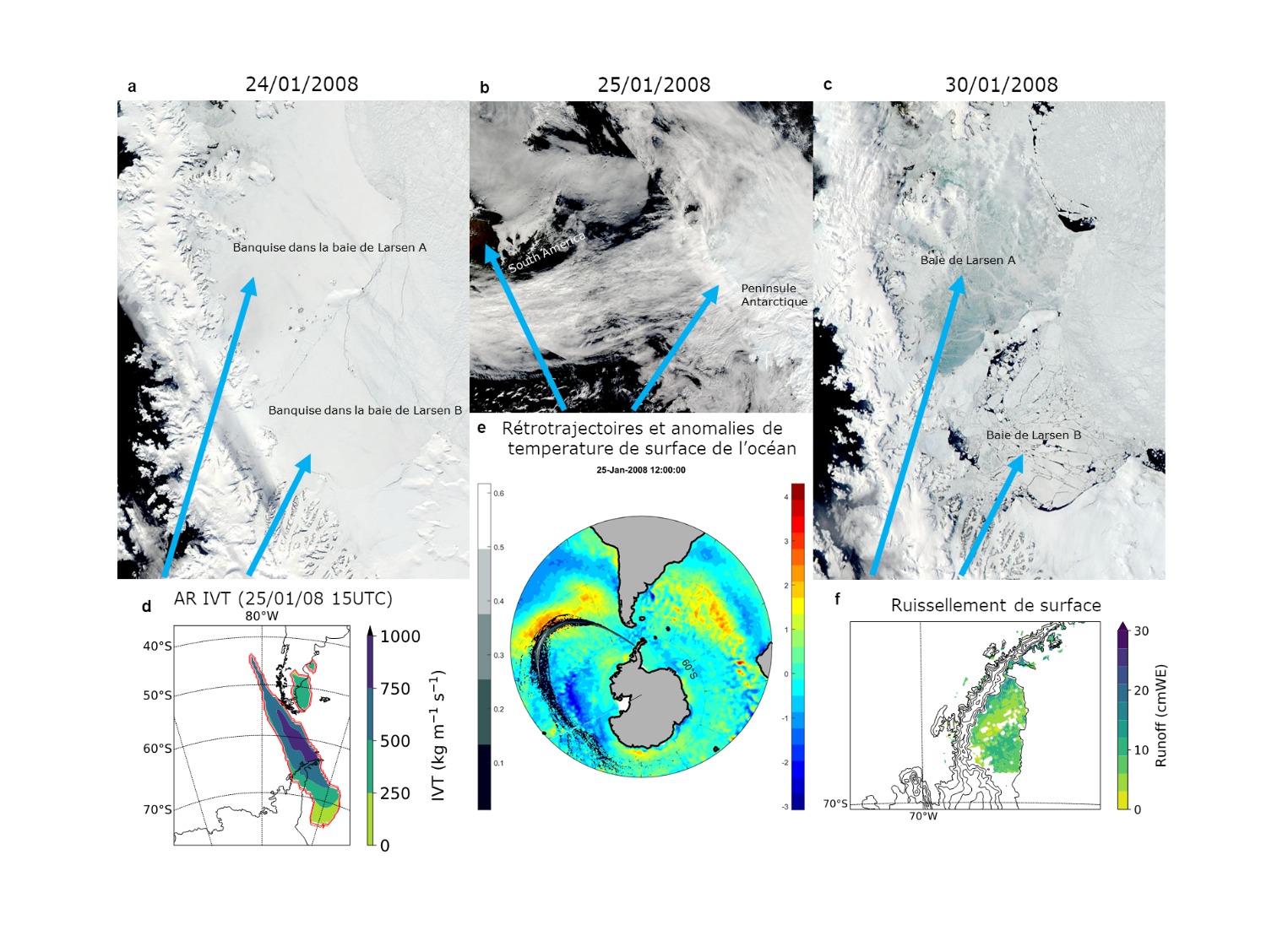 Les rivières atmosphériques représentent de fines bandes de circulation atmosphérique dans lesquelles d’importantes quantité de vapeur d’eau sont transportées des tropiques vers les hautes latitudes. Cette étude montre que les rivières atmosphériques causent la grande majorité des extrêmes de température et de précipitations sur la péninsule Antarctique, dont le record absolu de température pour l’ensemble du continent Antarctique (18,3°C), établi à la station d’Esperanza le 6 février 2020. Ces températures extrêmes entraînent une intense fonte de surface et la saturation de la neige par l’eau liquide, puis provoque le ruissellement horizontal et le remplissage de lacs et de crevasses. Ce phénomène contribue au processus de fracturation hydraulique, qui est un des moteurs des désintégrations. Les rivières atmosphériques provoquent également l’éparpillement de la glace de mer autour des plateformes (figure 2), permettant à la houle océanique d’atteindre les plateformes qu’elle fragilise par mouvement de flexion. Ces effets des rivières atmosphériques ont été observés lors de l’effondrement des plateformes de glace de Larsen A et B, et lors de 60 % des événements de vêlage de grands icebergs après l’année 2000. Ainsi, les rivières atmosphériques les plus intenses provoquent une série d’impacts (résumés dans la figure 1) tels que les extrêmes de température, de fonte et de ruissellement de surface, la désintégration de la glace de mer et génération de houle intense ; tous ces processus étant connus pour déstabiliser les plateformes de glace.