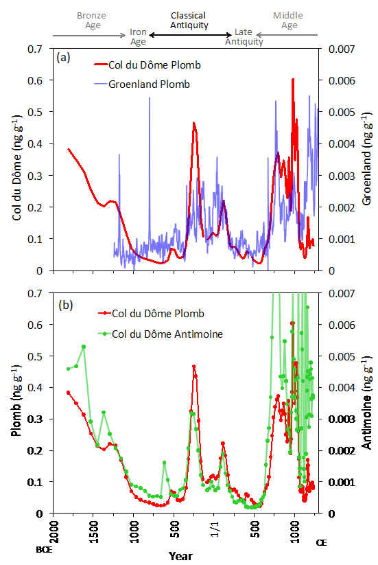 Lead and antimony in basal ice from Col du Dome (French 1 Alps) dated with radiocarbon : A record of pollution during AntiquitySusanne Preunkert, Joseph R. McConnell, Helene Hoffmann, Michel Legrand, Andrew Wilson, Sabine Eckhardt, Andreas Stohl, Nathan Chellman, Monica Arienzo, Ronny Friedrich, Geophysical Research Letters, 7 mai 2019