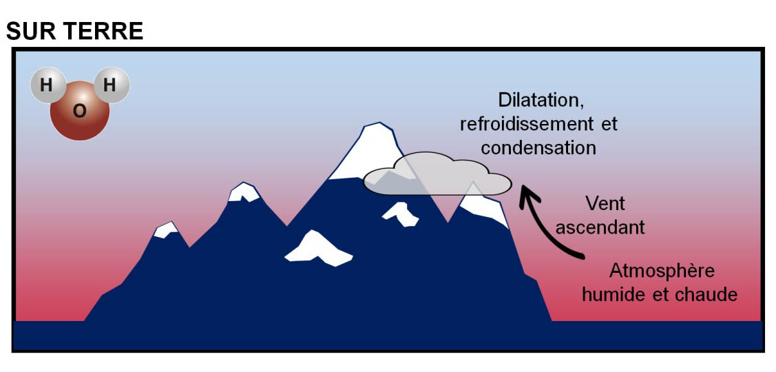 Sur Pluton la situation est très différente : l’atmosphère se réchauffe avec l’altitude à cause du rayonnement solaire. Très peu dense, elle n’influence pas la température du sol qui reste uniformément froid partout. Sur le flanc des montagnes, l’air est refroidi au contact de la surface et tend à dévaler les pentes, créant ainsi de forts vents descendants.