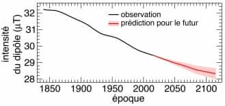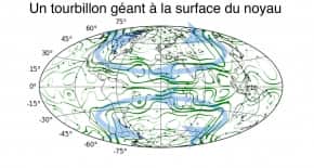 Ces derniers ont d’abord expliqué les raisons de la décroissance de l’intensité du champ magnétique terrestre de 10% depuis 1840. Le coupable est la présence d’une anomalie de ce champ, d’intensité plus faible, située au-dessus de l’Amérique du Sud de nos jours : elle déséquilibre le mécanisme de transport du champ magnétique. Ce mécanisme s’appuie sur un tourbillon géant à la surface du noyau, qui, à la manière d’un tapis roulant, déplace le champ magnétique des pôles vers l’équateur au niveau de l’Asie, et de l’équateur vers les pôles au niveau de l’Amérique. Les simulations des scientifiques prédisent que l’anomalie et le tourbillon sont intimement liés et qu’ils devraient tous deux dériver d’environ 3000 kilomètres vers l’Ouest (à la surface de la Terre) dans les cent prochaines années. L’anomalie se creusera de manière significative dans le siècle à venir, ce qui élargira la zone problématique pour le vol des satellites [1]. Mais, de même qu’on ne peut prédire avec certitude le temps qu’il fera dans un an, il est impossible de prévoir le comportement du champ magnétique terrestre à plus long terme, et en particulier la prochaine inversion des pôles.