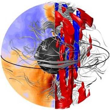Les structures tourbillonaires de l’écoulement sont représentées en rouge et bleu. Le champ magnétique interne est représenté en orange et violet, ainsi que par les lignes de champ dans le volume qui sont tordues par l’écoulement.