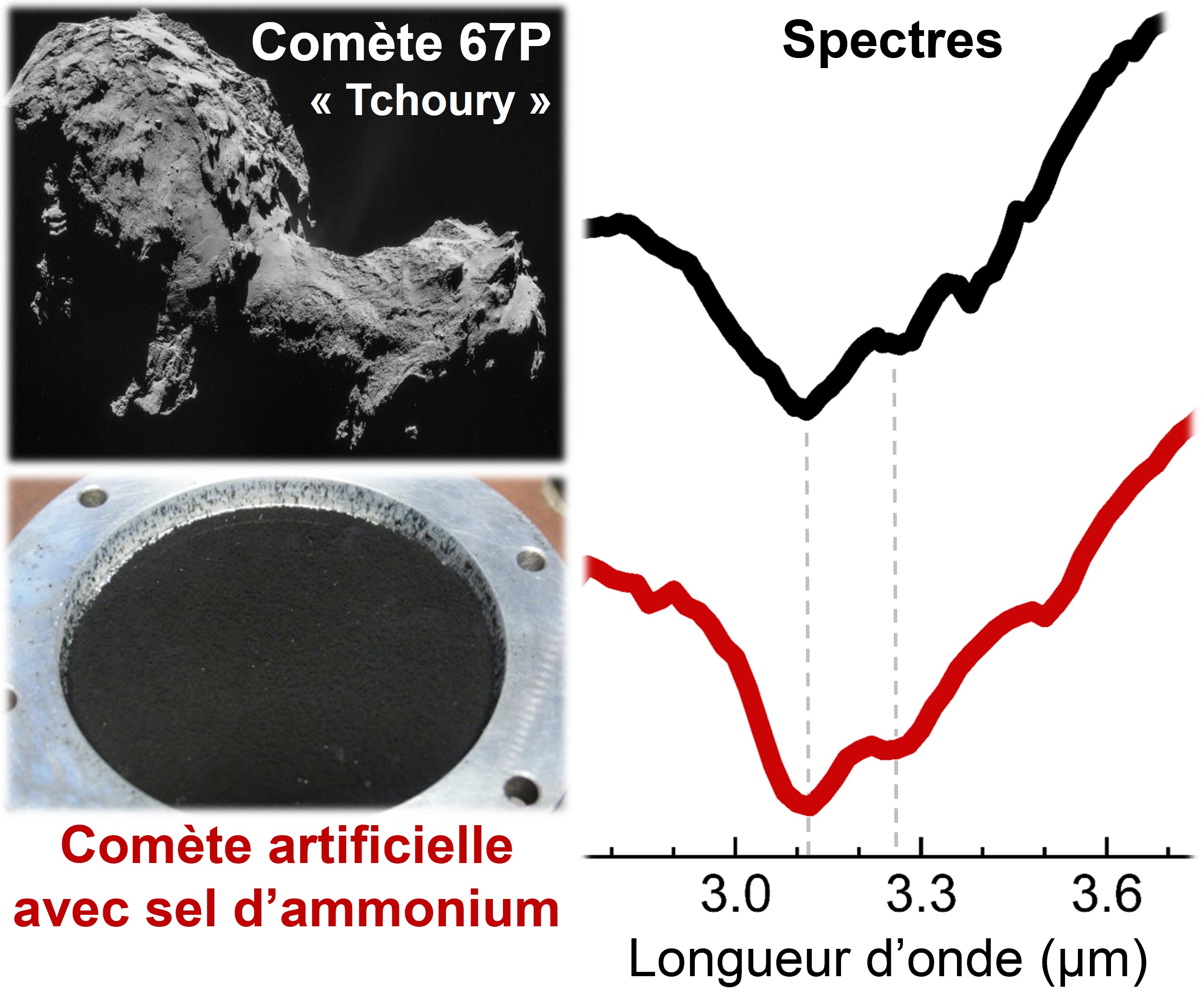 Pour déterminer quels composés sont à l’origine de ce massif d’absorption, les chercheurs de l’IPAG ont effectué des expériences de laboratoire consistant à fabriquer et à mesurer les spectres de comètes artificielles. De fines particules de glace d’eau contenant des grains de minéraux opaques ainsi que des molécules organiques ou des sels d’ammonium ont d’abord été produites. Puis ces particules de glace ont été placées dans une chambre de simulation reproduisant les conditions de température (environ -100°C) et de vide spatial régnant à la surface d’une comète. Soumise à ces conditions, la glace d’eau se sublime, passant de l’état solide à gazeux, et les impuretés (les autres molécules et minéraux) forment un résidu poreux de grains très fins et de texture analogue à une surface cométaire. En comparant le spectre de la lumière réfléchie par ces surfaces cométaires artificielles contenant des sels d’ammonium, avec celui de la surface de la comète "Tchoury" mesuré par VIRTIS, les chercheurs ont identifié ces sels (par exemple le formate d’ammonium, NH4+ HCOO-) comme étant les principaux responsables du massif d’absorption vers 3,2 µm observé sur le noyau cométaire.
