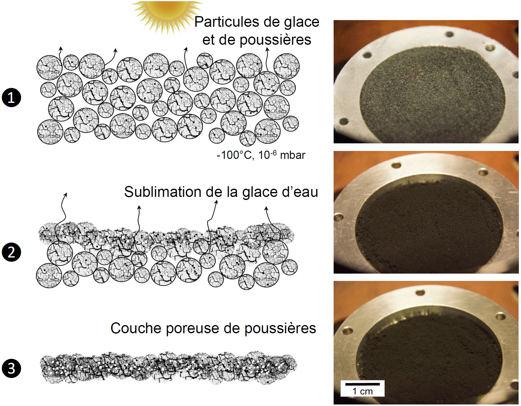 Fabrication d’une comète artificielle au laboratoire. Des particules de glace et de poussières (minéraux, composés carbonés, sels d’ammonium) sont placées sous vide et à basse température. La glace se sublime, laissant une couche poreuse de poussières analogue à une surface cométaire.