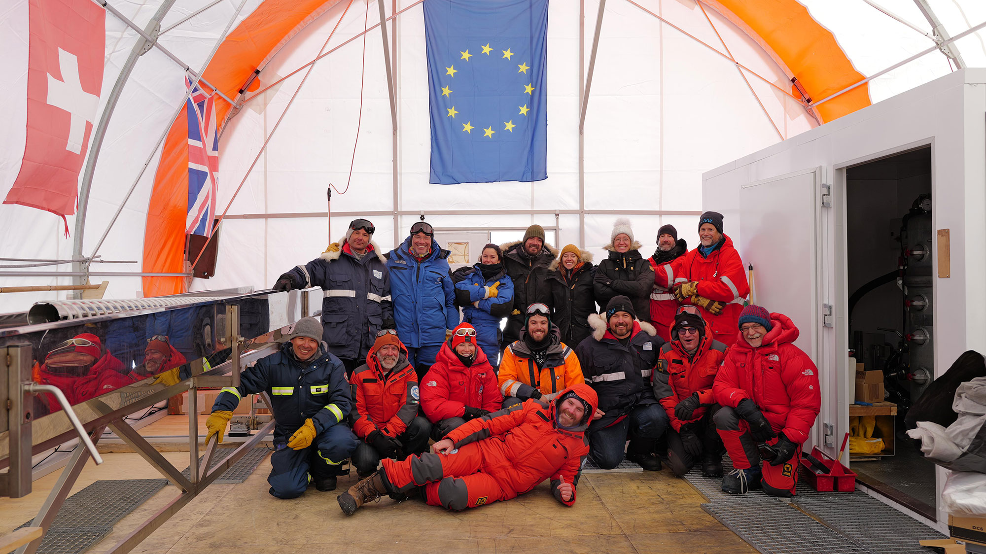 Olivier Alemany (chef des opérations) et Philippe Possenti du CNRS, Rémi Dalmayr, Matthias Hüther (chef foreur), Gunther Lawer, Johannes Lemburg de l’Alfred Wegener Institut (AWI, Allemagne), Andrea Ceinini et Saverio Panichi (chef de camp) de l’ENEA (Italie), Inès Gay de l’IPEV, James Veale du British Antarctic Survey (BAS, UK), Federico Scoto du CNR (Italie), Fortunat Joos et Michaela Mühl de l’Université de Bern (Suisse), Tamara Gerber, Iben Koldtoft et Julien Westhoff (chef scientifique) de l’Université de Copenhague (Danemarque).