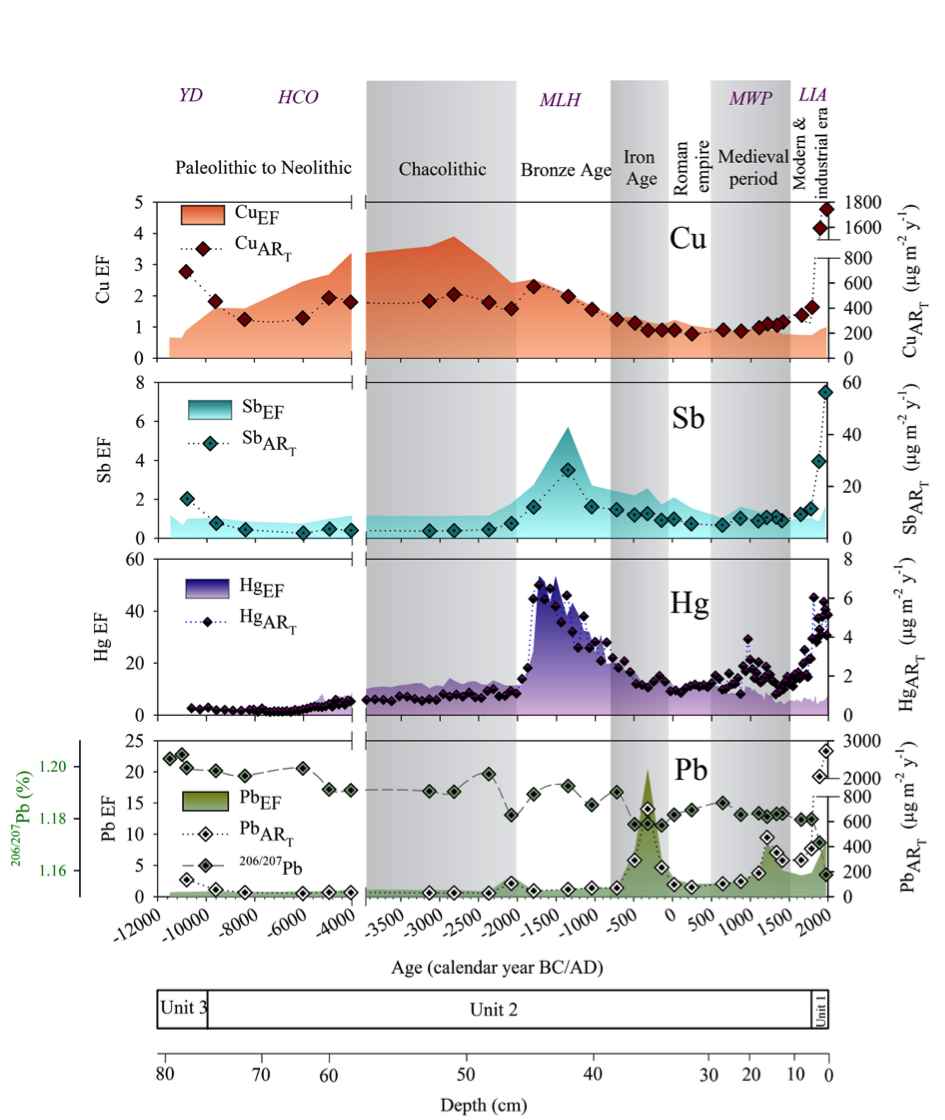 En ce qui concerne la pollution atmosphérique, les chercheurs ont identifié 4 périodes de pollution : l’Âge de Bronze (1800-1000 av. J.-C.), l’Âge de Fer et l’Empire Romain (800 av.J.-C.-1000 après J.-C.), le Moyen-Âge 500-1500 après J.-C.) et les époques modernes et industrielles (1500-2000 après J.-C.).