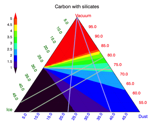Les études actuelles s’appuient sur une interprétation plus précise de la constante diélectrique du noyau (proche de 1,27) à partir de mesures en laboratoire de la permittivité de glaces (d’eau, de monoxyde et de dioxyde de carbone) et de minéraux ainsi que d’analogue de matériaux cométaires (Brouet et al., 2016 [6] ; Herique et al, 2002 [7] ; Heggy et al., 2012 [8]). Cette analyse, utilise les formules de mélanges de matériaux diélectriques ainsi que les estimations de la densité et du rapport poussières / glaces pour montrer que la fraction réfractaire doit avec une permittivité faible pour pouvoir expliquer la constante diélectrique mesurée par CONSERT. Ces résultats permettent d’exclure que les particules de poussière cométaire aient une composition essentiellement minérale. Les modèles proposés pour la composition de l’intérieur du noyau permettent d’affirmer que la matière carbonée est largement présente, correspondant jusqu’à 75% en volume dans la composition des poussières.