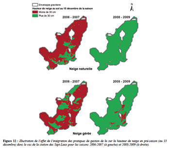 Dans quelles mesures la gestion de la neige impacte-t-elle alors la viabilité de l’enneigement d’une station ? À titre d’exemple, si la gestion de la neige a significativement amélioré la viabilité du domaine des Sept-Laux pendant la saison 2006-2007, elle n’a toutefois pas compensé le déficit en neige naturelle à l’ouverture de la saison, en raison de températures trop douces pour la production de neige de culture [b].