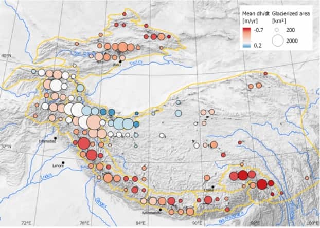 En moyenne, ces glaciers s’amincissent d’environ 20 cm par an, ce qui est 3 à 5 fois moins que dans les Alpes pour la même période et environ 2 fois moins que la moyenne des glaciers de l’ensemble du globe. L’étude souligne aussi la très forte hétérogénéité des réponses des glaciers, hétérogénéité qui résulte à la fois de l’hétérogénéité du changement climatique, mais aussi de la sensibilité des glaciers qui module leur réponse. L’étude confirme notamment que les glaciers gagnent de la masse dans certaines régions, ce qui n’est observé nulle part ailleurs sur Terre. Depuis 2005, les glaciologues savaient que les glaciers situés au Pakistan étaient stables et même certains gagnaient de la masse, une particularité nommée "l’anomalie du Karakoram". La nouvelle étude montre que cette anomalie perdure et est en fait centrée sur le massif du Kunlun, à l’ouest du Plateau du Tibet.
