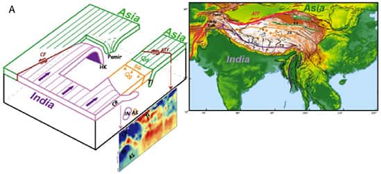 Dans un deuxième temps, les chercheurs ont étudié la subduction du continent asiatique. Leur expérimentation leur a permis de démontrer que cette subduction se produit alors que le slab n’est pas attaché à une plaque océanique lourde. La force principale n’est pas le slab pull, qui est négatif pour un slab plus léger que le manteau, mais les forces tectoniques horizontales, qui se transmettent du piston (qui simule la collision en poussant l’Inde) à l’Asie (figure 1B). Ce processus se produit actuellement sous le Pamir, à l’ouest de la zone de collision, où la lithosphère asiatique plonge vers le sud (figure 1A). Il s’est aussi produit au début de la collision sous la suture de Jinsha, séparant le bloc de Songpan du bloc de Qiangtang (figure 1A). Ils ont appelé ce processus la subduction collisionelle de l’Asie, "Asian collisional subduction".