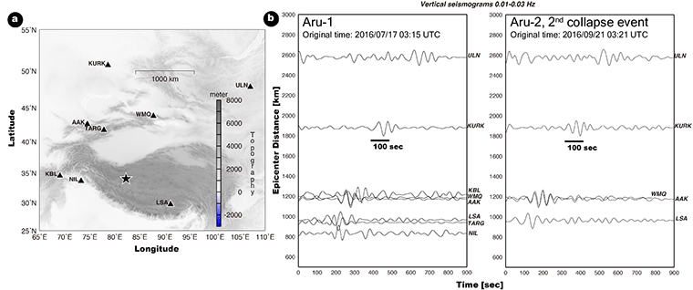 Le 17 juillet 2016, un glacier de la cordillère Aru au Tibet s’est soudainement détaché, formant une avalanche de glace qui tua 9 personnes. Le 21 septembre 2016, un autre glacier situé à moins de 3 km s’écroulait à son tour sans faire de victimes. Ces événements ont surpris les spécialistes du risque glaciaire, car il n’existait qu’un seul cas similaire documenté auparavant (celui du glacier Kolka dans le Caucase en 2002). L’effondrement du second glacier avait pu être anticipé grâce aux avancées récentes en télédétection (actualité du 02 octobre 2016).