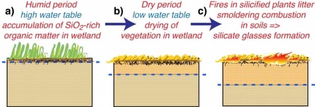 D’après les observations de terrain, les sols vitrifiés sont distribués principalement dans d’anciennes zones humides où l’on peut encore observer des litières de plantes silicifiées. Le désert d’Atacama a en effet connu des périodes humides à la fin du Pléistocène, contemporaines des phases de développement maximum des grands paléolacs du sud de l’Altiplano Bolivien aujourd’hui représentés par le salar d’Uyuni et le salar de Coipasa. De grandes oasis se sont développées le long du piedmont andin lorsque la nappe phréatique était presque au niveau du sol. De la matière organique et des plantes riches en précipités minéraux (phytolithes) ou partiellement silicifiées se sont accumulés dans le sol des zones humides. Les incendies peut-être ressemblant aux feux de tourbes se sont déclenchés lorsque le climat est devenu plus aride, au moment de l’abaissement de la nappe phréatique. Ces résultats montrent que sous certaines conditions environnementales et climatiques, les températures lors d’incendies spontanés peuvent être suffisamment élevées pour vitrifier les sols. Cette étude conduira certainement à reconsidérer l’origine de certains verres décrits comme verres d’impacts dans d’autres régions du monde (Verre Lybique, mais surtout ceux d’Edeowie en Australie, de Dakhleh en Egypte ou ceux décrits dans des sédiments Miocène d’Argentine), avec des implications pour la quantification de l’aléa lié à l’explosion de bolides dans l’atmosphère de la Terre.