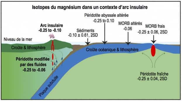 Le magnésium analysé dans les basaltes de la Martinique vient du coin du manteau (cf schéma) dont la composition isotopique a été modifiée par rapport à celle des péridotites fraîches sous l’effet des fluides venant de la déshydratation des basaltes et péridotites altérées de la plaque subduite. Les sédiments subduits jouent, quant à eux, un rôle négligeable.