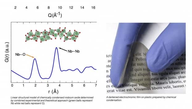Le nouveau matériau électro-chromique a une structure amorphe, de façon similaire a son homologue synthétisé à haute température, ce qui signifie que les atomes manquent l’organisation périodique que l’on trouverait dans un cristal. Il y a relativement peu d’informations sur les matériaux amorphes et sur la manière dont leurs propriétés sont touchées par la structure locale".