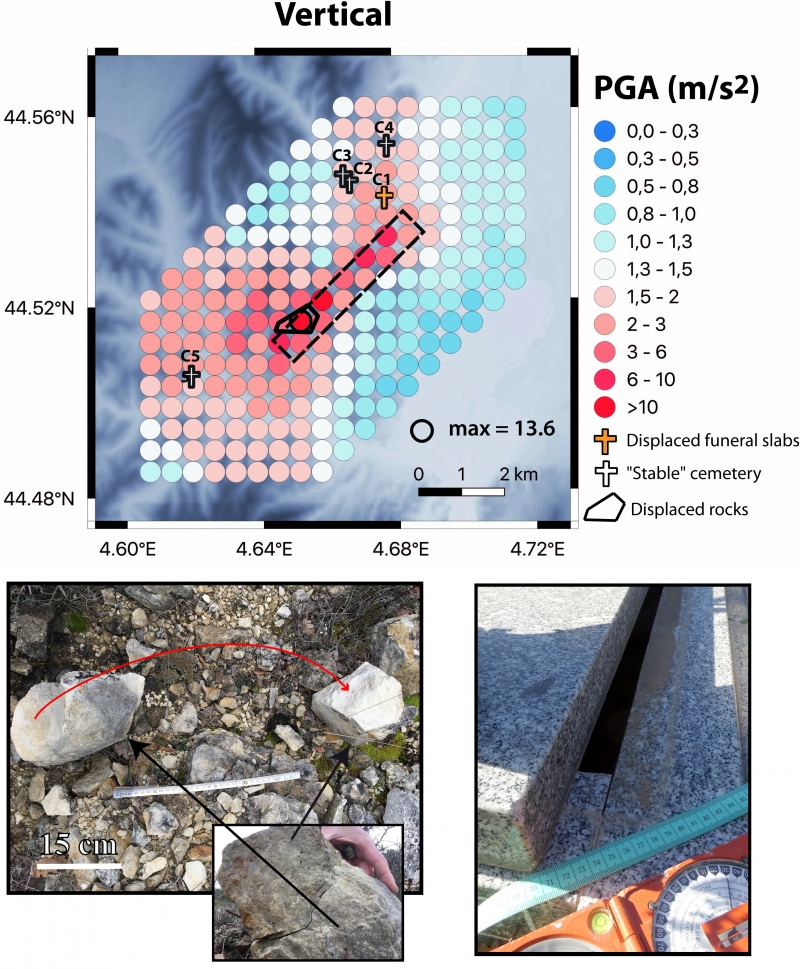 Les résultats indiquent des niveaux d’accélération extrêmes, dépassant localement la gravité. Ces niveaux inattendus ont pu être confirmés grâce à des observations in-situ d’objets déplacés lors de la secousse sismique. Ces observations précieuses incluent, entre autres, des déplacements de dalles funéraires (glissement de 1 à 10 centimètres), dont la modélisation numérique a permis de remonter aux niveaux d’accélération. D’autre part, des fragments de roches fraîchement brisées ont été retrouvés au-dessus de la zone de faille. Ces roches, vraisemblablement propulsées en l’air lors la secousse, puis cassées à l’impact sur le sol, sont les témoins d’une accélération verticale qui a dépassé la gravité. Les futures analyses géologiques et géophysiques locales devraient permettre de mieux contraindre la potentialité de séismes de ce type ailleurs sur le système de failles des Cévennes, notamment à proximité des centrales nucléaires de Cruas et du Tricastin.