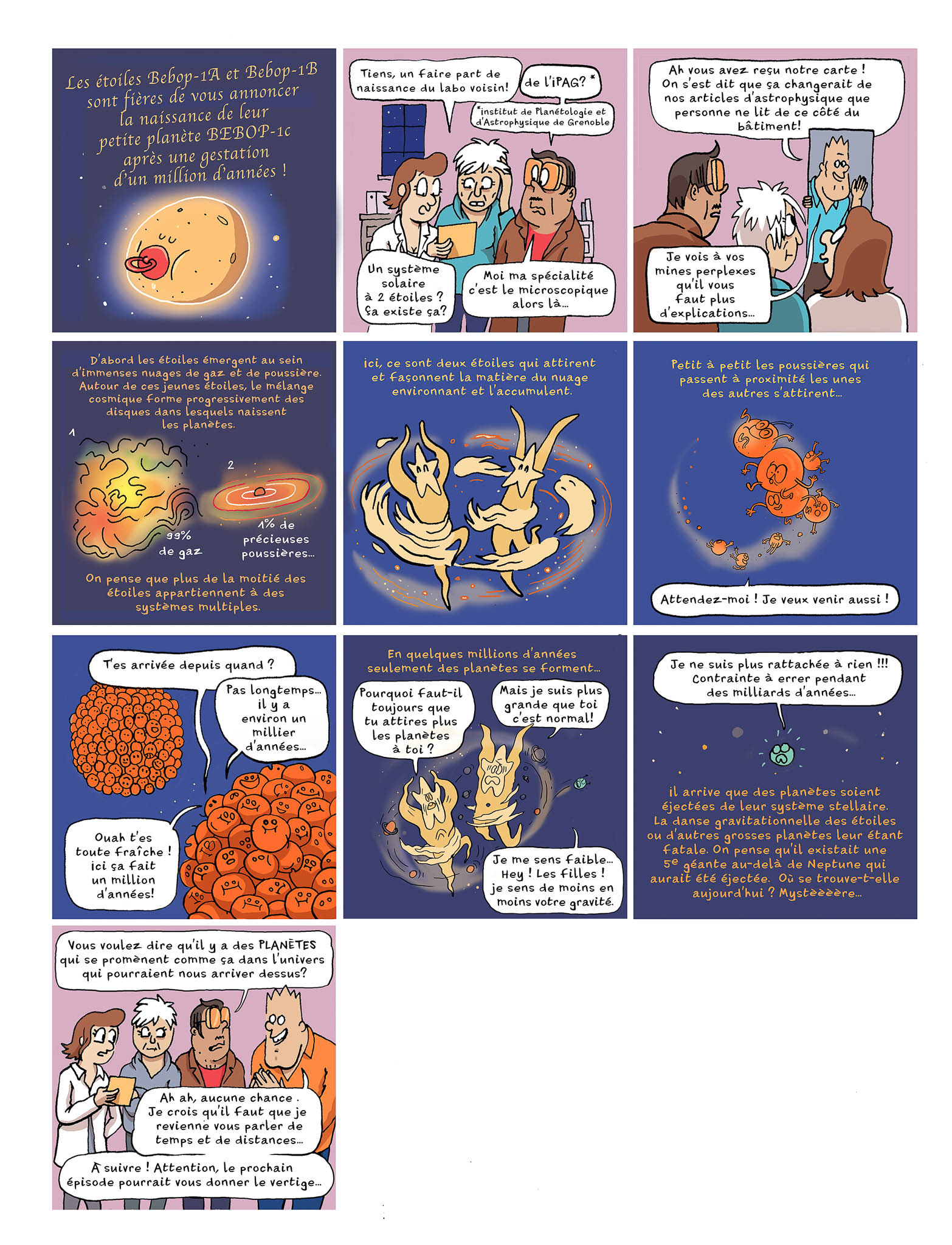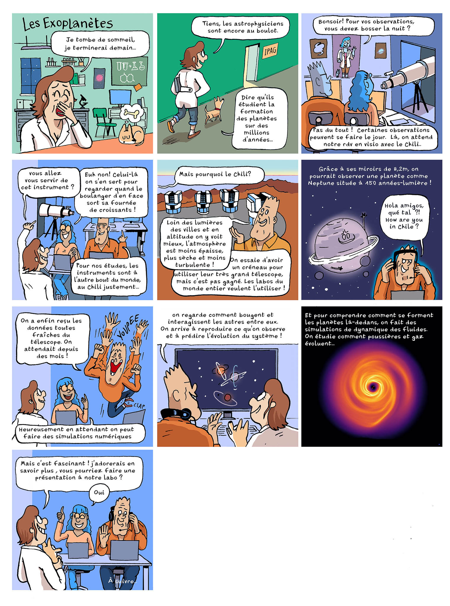Pour répondre à ces questions et illustrer le travail de recherche mené à l’Institut de Planétologie et d’Astrophysique de Grenoble (IPAG-OSUG), les scientifiques de l’équipe du projet européen Stellar-MADE dirigée par Nicolás Cuello, enseignant-chercheur UGA à l’IPAG, ont collaboré en partenariat avec Ink Link et Séverine Alvain, Chargée de médiation scientifique au CNRS à la réalisation de 4 planches de BD.