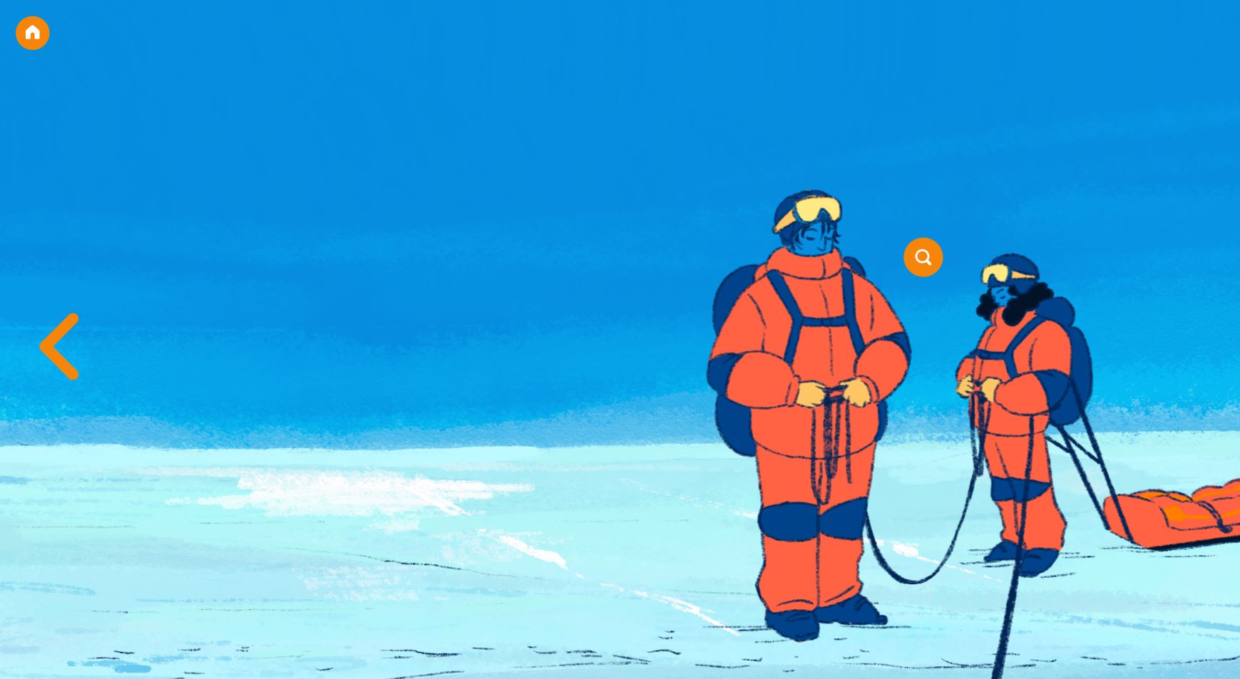 Le deuxième chapitre nous ramène en 2026. Samira se réveille dans la peau de sa grand-mère, sur la base scientifique française de Dumont D’Urville, en Antarctique. Sur le glacier de l’Astrolabe, elle découvre les processus glaciaires et la perte de masse des glaciers à travers des quiz et des jeux interactifs, comprenant ainsi leur contribution à l’élévation du niveau des mers.