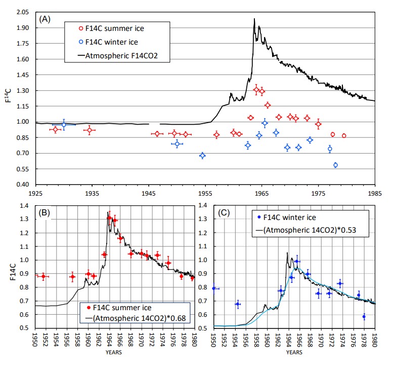 L’analyse chimique de carottes de glace extraites en 2009 au Mt Elbrus dans le Caucase ont permis de documenter et comprendre l’évolution au cours du 20ième siècle des teneurs en carbone organique dissous (DOC) et de sa signature en 14C afin de distinguer le carbone issu de la biomasse de celui provenant des combustibles fossiles. Ceci a nécessité d’adapter la mesure du 14C aux très faibles masses de carbone présentes dans la glace de haute altitude (quelques micrograms). Proche de l’unité, la fraction de carbone modern (F14C) de la glace déposée avant 1950, décroit sensiblement dans les années 60. La comparaison entre la perturbation du F14C du CO2 atmosphérique résultant des tests nucléaires atmosphériques et l’évolution du F14C dans la glace du Caucase indique pour la période 1955-1980 une contribution anthropique de 32% en été, 47% en hiver.