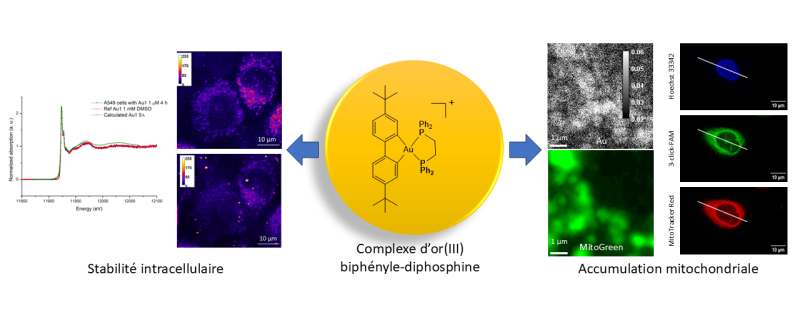 Les composés examinés [2] présentent tous une toxicité élevée pour les cellules tumorales. Les analyses, basées sur des techniques spectroscopiques et microscopiques utilisant le rayonnement X produit par un synchrotron, montrent que tous les complexes sont stables à la fois dans des environnements extracellulaires et à l’intérieur de cellules cancéreuses du poumon. Ils ne subissent pas de modification de structure et les atomes d’or restent liés aux ligands. Par microscopie de fluorescence X, les scientifiques sont parvenus à « cartographier » les éléments chimiques, y compris l’or, dans des cellules cancéreuses du poumon hydratées préservées par cryogénisation, avec une résolution de l’ordre de quelques dizaines de nanomètres. L’or s’accumule sélectivement dans les mitochondries, les « centrales électriques » des cellules.