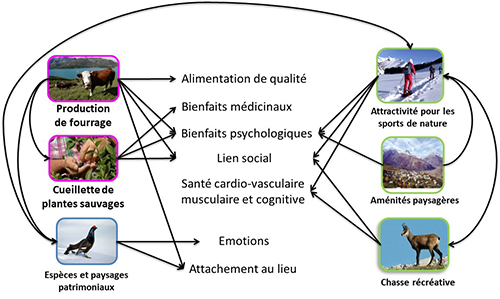 En particulier les prairies et pelouses gérées par le pastoralisme accueillent une biodiversité élevée et offrent toute une série de bénéfices économiques, de santé et de bien-être. Il s’agit non seulement de produits agricoles souvent labellisés mais aussi de la valeur culturelle des paysages ouverts et des espèces spécialistes de ces milieux, de la valeur pour les activités récréatives de plein air et de fonctions de régulation du climat global (par les stocks de carbone des sols), de l’érosion des sols (selon les pratiques de gestion pastorale) ou des avalanches. La durabilité de l’élevage en haute montagne est tributaire des évolutions des politiques publiques agricoles et de biodiversité, du maintien et de l’amélioration des conditions d’emploi en montagne, et du développement de la pluriactivité, de l’innovation et des infrastructures.