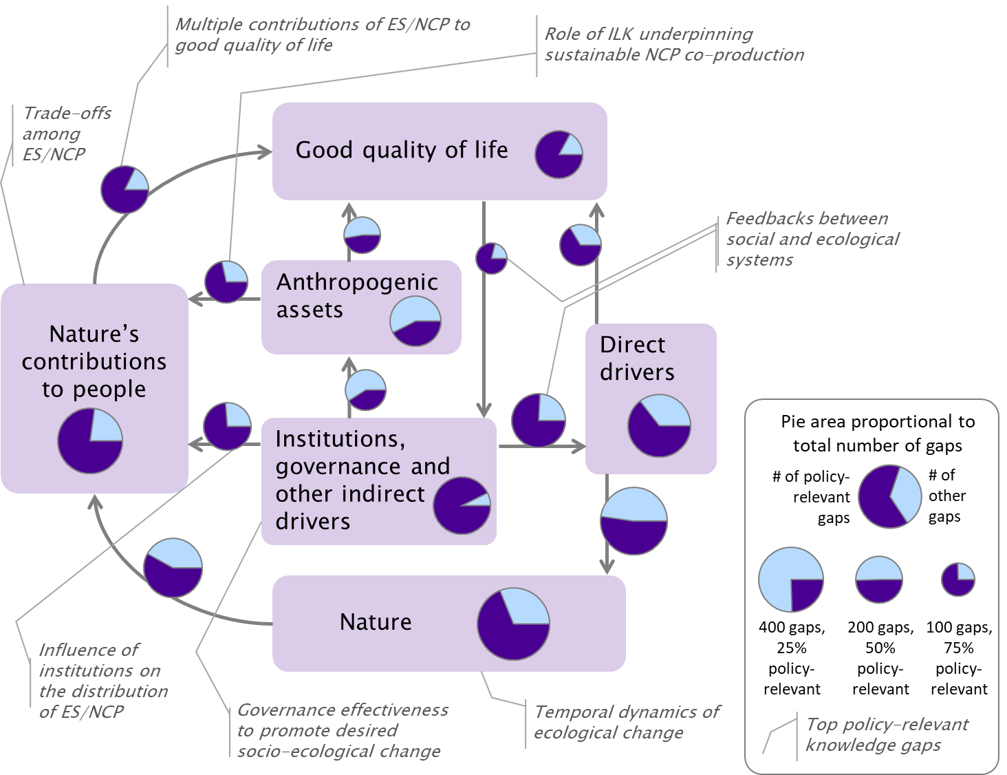 L’analyse a révélé que des progrès avaient été accomplis pour combler certaines des lacunes de connaissances identifiées dans l’Évaluation des écosystèmes pour le millénaire, de 2005, notamment une meilleure compréhension des tendances à long terme des changements écologiques. Néanmoins, après des décennies de recherche, certaines lacunes de connaissances persistent et des nouvelles ont émergé. Cependant, les nécessités de connaissances les plus pressantes sur les interactions entre systèmes sociaux et écosystèmes restent les mêmes depuis 2005. De plus, les évaluations de l’IPBES ont montré des lacunes importantes sur le rôle des connaissances autochtones et locales dans la préservation de la nature et de ses contributions aux populations. Les auteurs estiment qu’il faut maintenant faire entrer dans la discussion ceux qui ont une expertise approfondie des mécanismes de changement social et de gouvernance, y compris les acteurs et les décideurs locaux.