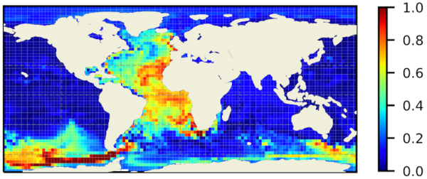 Premier fait marquant : les dimensions de ce mode aléatoire excèdent de très loin la taille des tourbillons qui peuvent localement l’engendrer. En outre, les fluctuations aléatoires de pression de fond dues à ce mode de très grande échelle sont d’amplitude significative. La figure 2 montre l’amplitude de ce signal aléatoire par rapport à celui, ”déterministe”, dû à l’atmosphère : ces fluctuations aléatoires peuvent atteindre 50-80% des fluctuations déterministes dans tout l’est de l’Atlantique, et même excéder celles-ci au sud-est du Pacifique. Les transferts de masse entre bassins océaniques ne sont donc pas entièrement contrôlés par l’atmosphère.