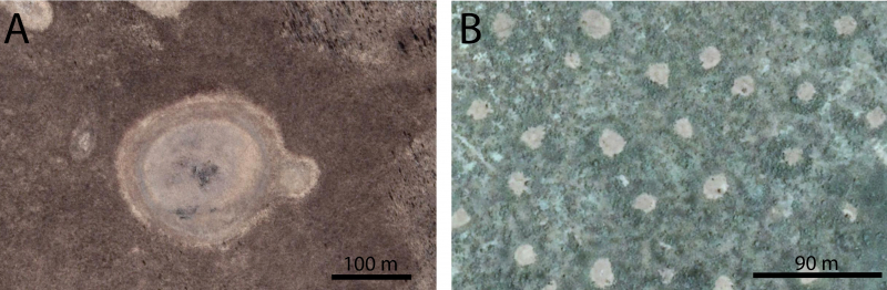 Des scientifiques d’ISTerre [4], l’un des laboratoires de la fédération OSUG, ont mis en évidence que la plupart des concentrations élevées en hydrogène mesurées jusqu’alors en contexte continental, se situaient à proximité de gisements d’or [5] . A l’aide d’images satellites, ils ont aussi découvert la présence de structures géomorphologiques communément associées à des émanations de gaz (H2 et CO2) à proximité de 32 gisements d’or à travers le monde. Ces structures sont des dépressions circulaires dépourvues de végétation et de taille variable allant de quelques mètres à plusieurs kilomètres (Figure 1A). Une étude statistique des plus petites structures a montré une organisation en motifs hexagonaux périodiques (Figure 1B). Cette dernière propriété est caractéristique des cercles de fées, des curiosités géomorphologiques jusqu’alors principalement observées en Namibie et dont l’origine était attribuée à des processus exclusivement écologiques. Les minéralisations d’or sont généralement associées à des niveaux riches en carbonates de fer. Sur cette base, les scientifiques ont proposé un modèle géochimique de production d’hydrogène à partir de la dissolution des carbonates de fer, tel que cela a déjà pu être démontré expérimentalement par le passé [6]. La formation des structures géomorphologiques résulterait alors de la dissolution des carbonates de fer et de la diminution du volume de la roche associée. L’H2 et le CO2 ainsi produits pourraient ensuite directement ou indirectement affecter le développement de la végétation au sein de la structure.
