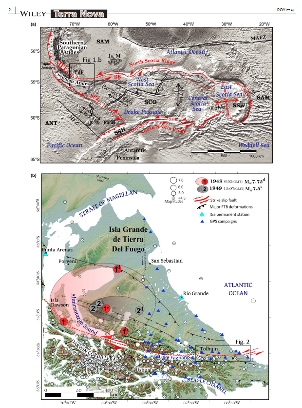 Co‐seismic deformation and post‐glacial slip rate along the Magallanes‐Fagnano fault, Tierra Del Fuego, Argentina, Roy S., R. Vassallo, J. Martinod, M. C. Ghiglione, C. Sue, P. Allemand. Terra Nova 32, 1, pp. 1-10 (2020)