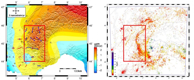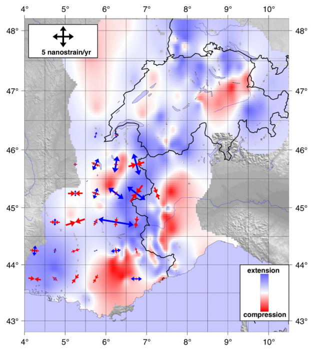 Finalement, les mesures GPS disponibles montrent des premières évidences d’une séparation spatiale entre le maximum de surrection et le maximum d’extension et de sismicité. Si ce phénomène est confirmé par des séries de mesure plus longues, il appelle à une combinaison de différents processus pour expliquer la dynamique actuelle des Alpes occidentales.