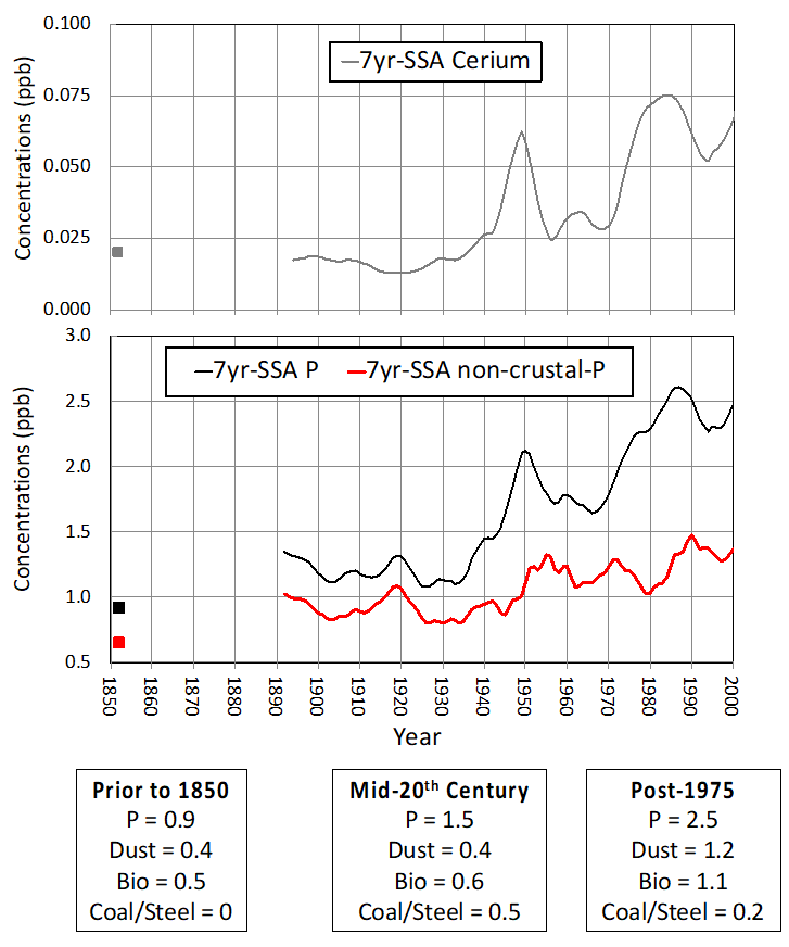 Cette étude unique du phosphore dans la glace réalisée par une équipe de recherche du CNRS-INSU [2], montre une augmentation d’un facteur 2-3 des dépôts entre la période préindustrielle et la fin du 20ième siècle. Cette augmentation résulte tout d’abord d’une augmentation récente des émissions terrigènes (apports sahariens en particulier) comme en témoigne l’augmentation du cérium. Elle a été accompagnée d’une augmentation des émissions liée à la forte expansion des forêts en France après 1960. Enfin, les émissions fortement polluantes résultantes de la combustion du charbon et la sidérurgie ont également perturbé le budget du phosphore au milieu du 20ième siècle pour décroître fortement dans les années 80 suite à l’installation de filtres à particules et système de désulfurisation. Par ailleurs, ces observations dans la glace sont en meilleur accord avec la fourchette basse des estimations des émissions de phosphore proposées dans la littérature tant pour la végétation que pour les combustions.