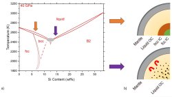 De plus, les échantillons ont été récupérés après les expériences et la composition chimique des différentes phases étudiées ex situ. Sous haute pression, on observe la formation d’une phase de structure cubique centrée à des températures proches de la fusion, et lors de la fusion, les alliages étudiés évoluent vers deux compositions liquides distinctes, une riche et l’autre pauvre en Fe. L’évolution du diagramme de phase avec la pression et la température prescrit donc des régimes possibles de cristallisation du noyau de Mercure très différents, dépendant de l’abondance exacte en Si dans le noyau.