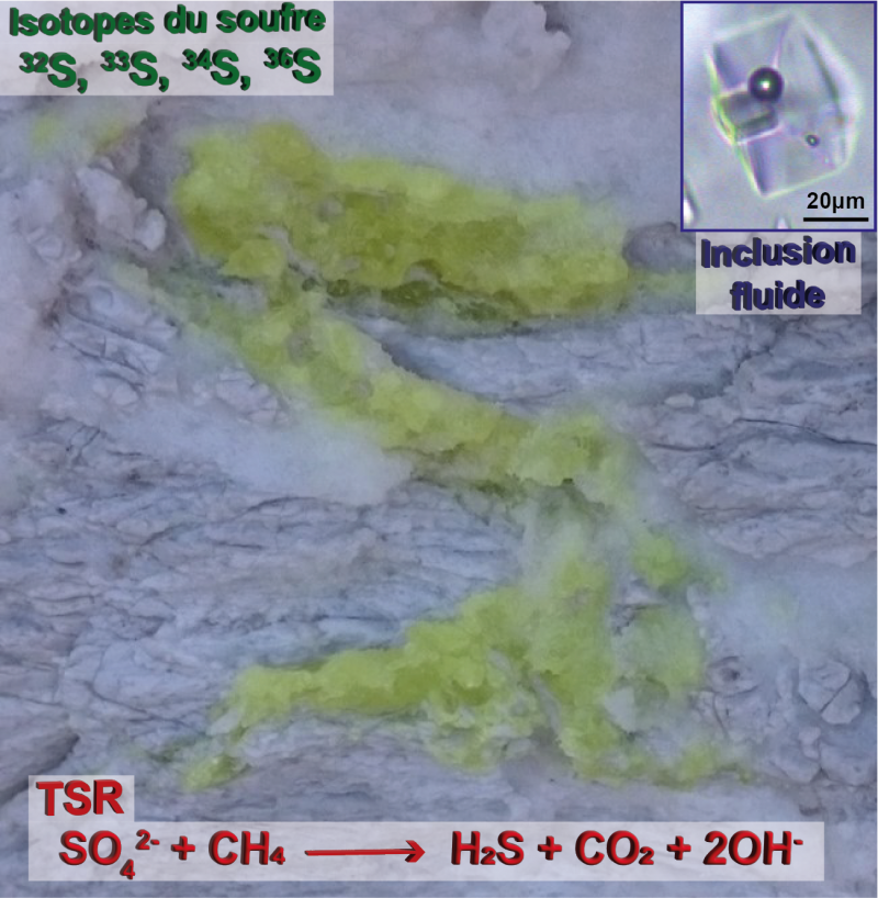 Les scientifiques ont également voulu savoir comment traquer ce processus et ces espèces particulières du soufre dans d’autres contextes géologiques. Pour ce faire ils ont analysé les isotopes du soufre des minéraux qui se sont formés grâce à la TSR (pyrite et soufre élémentaire notamment). Ils ont ainsi pu montrer que chaque espèce avait une signature isotopique particulière qui permet de retracer précisément l’origine du soufre et le devenir des différents produits de la réaction. Cette étude à grande échelle a ainsi permis de mieux comprendre le rôle dans le cycle du soufre de ce processus majeur qu’est la TSR, puisqu’il permet d’expliquer la formation de gisements métallifères ou de gisements pétroliers très riches en soufre partout à travers le globe.
