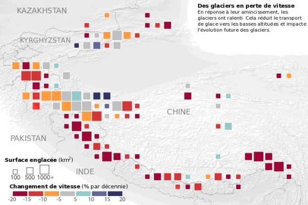 Les glaciers se forment par accumulation de neige en haute altitude, puis s’écoulent sous l’effet de la gravité vers les basses altitudes où ils fondent en raison des températures plus élevées. Le poids de la glace la force à glisser sur le socle rocheux et à se déformer, comme un fluide visqueux tel le miel, le long des pentes. Lorsque le glacier s’amincit et perd de la masse, le glissement et la déformation de la glace deviennent tous les deux plus difficiles, et le glacier ralentit. "Ce qui est fascinant dans cette étude c’est le lien fort entre l’épaisseur des glaciers et leur vitesse", nous dit Noel Gourmelen, de l’université d’Édimbourg et de l’université de Strasbourg, et co-auteur de l’étude. "Les régions où les glaciers s’amincissent le plus sont celles où ils ralentissent le plus. Dans les rares régions comme le Karakorum ou le Kunlun où les glaciers sont stables ou s’épaississent, nos observations montrent que les glaciers ont légèrement accéléré."
