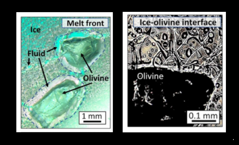 Dans une nouvelle étude financée par le projet ANR OASIS impliquant des chercheurs d’ISTerre/OSUG (CNRS, Univ. Grenoble Alpes), LEPMI (CNRS, Univ. Grenoble Alpes, Grenoble INP), GFZ (Helmholtz Zentrum-Potsdam), et LPG (CNRS, Nantes Univ., Univ. d’Angers, Le Mans Univ.), des scientifiques présentent de nouveaux résultats expérimentaux sur les interactions eau-glace-minéral de -20 à +22°C, basés sur l’olivine, un constituant majeur des corps rocheux du Système solaire. L’étude a montré qu’une altération chimique continue peut avoir lieu même à de basses températures, inférieures à 0°C, grâce à un film mince d’eau liquide saturé en éléments anti-gel qui enveloppe les grains d’olivine pris dans la glace.