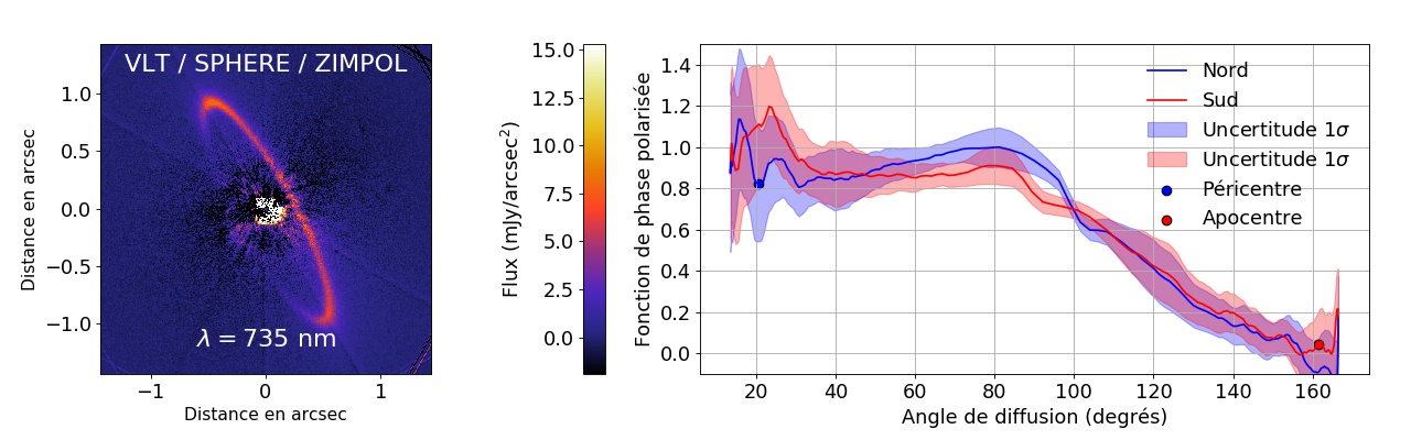 À l’aide de SPHERE, de nouvelles observations en lumière polarisée visible ont maintenant permis d’extraire la fonction de phase polarisée de ces particules et de confirmer ces conclusions quant à la présence de particules irrégulières, très différentes de billes compactes comme cela est souvent supposé dans un souci de simplicité dans les modélisations numériques. Par ailleurs, la fonction de phase polarisée est compatible avec les observations de comètes dans notre système solaire, avec une probable inversion de polarisation autour de 160 degrés de diffusion.