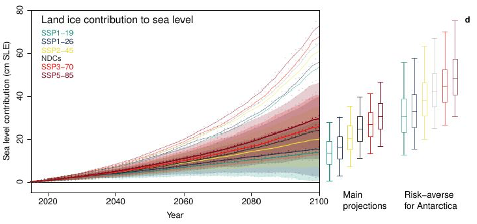 En conclusion, même en considérant un unique scénario d’évolution des émissions de gaz à effet de serre (NDCs ici), la gamme d’incertitude reste encore très large : l’estimation médiane d’élévation globale du niveau moyen des mers en 2100 est de 25 cm et l’estimation la plus pessimiste (c’est-à-dire avec des hypothèses physiques plausibles mais pessimistes pour les calottes polaires) est de 42 cm. Ainsi, les stratégies d’adaptation devraient prévoir un facteur d’incertitude plus élevé jusqu’à ce que les politiques “climatiques” et la réponse de l’Antarctique à l’évolution du climat soient mieux contraintes et connues.