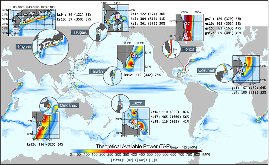 Les chercheurs ont réalisé une simulation à très haute résolution des courants océaniques (grille de calcul de l’ordre de 10 km), à l’échelle globale et de la surface au fond, sur une période de 5 ans avec le modèle communautaire de circulation océanique NEMO. Une comparaison avec les observations a montré que ce modèle donnait une bonne représentation des grands courants océaniques et de leur variabilité. Comme ces courants sont plus intenses près de la surface, les TPP devront être installés autant que possible à de faibles profondeurs. Cette simulation (sans TPP) a été utilisée pour calculer la puissance totale disponible dans l’écoulement (le TAP, pour Theoretical Available Power), pour des sections de 10 km de large dans la tranche de profondeur de 26 à 40 m, et ainsi identifier les sites les plus favorables à l’implantation de TPP.