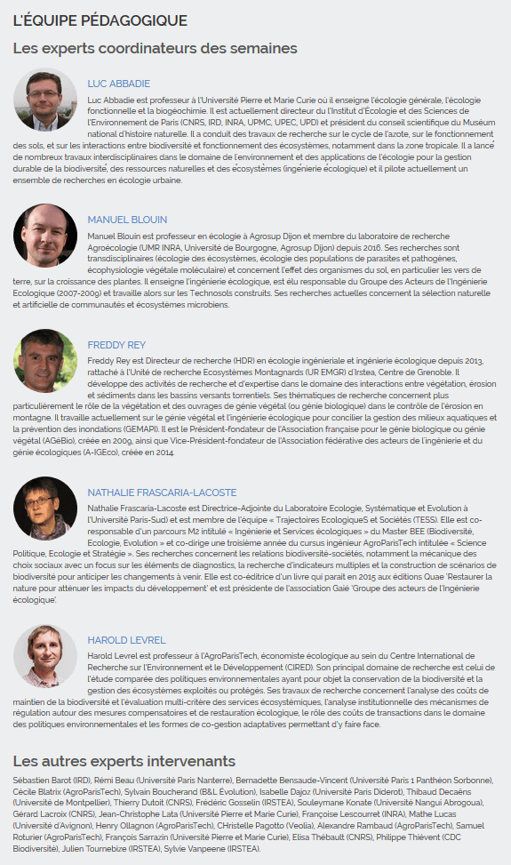 Freddy Rey coordonnera la semaine 3 dédiée aux domaines d’application de l’ingénierie écologique, où il présentera les défis à relever en matière de génie végétal et face à la nouvelle compétence GEMAPI (Gestion des milieux aquatiques et prévention des inondations).