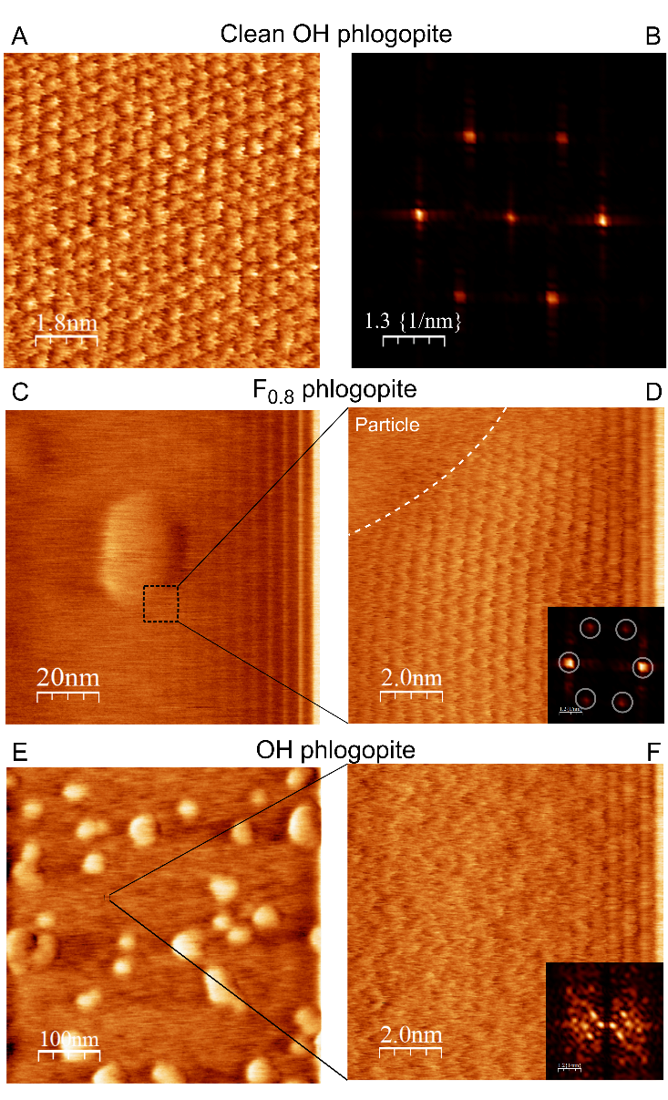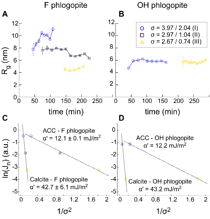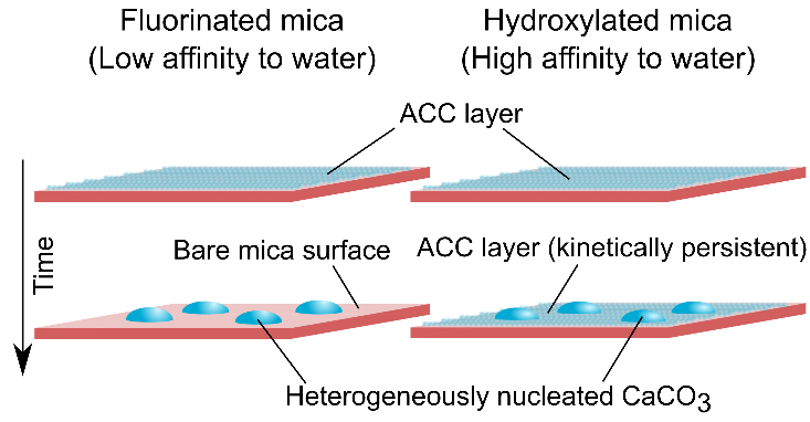 Les résultats montrent un comportement contrasté entre les substrats hydrophiles (OH-phlogopite) et hydrophobes (F-phlogopite) : le précipité de carbonate de calcium amorphe est plus persistant sur la surface hydroxylée (hydrophile) que sur celle fluorée (hydrophobe). En effet, les images AFM montrent que, alors que des cristaux de calcite isolés se forment sur le phlogopite hydrophobe, une couche d’ACC persiste plus longtemps sur le substrat de phlogopite hydrophile, retardant ainsi la cristallisation (Figures 2 et 3). Ce résultat peut être rationalisé par le caractère hautement hydraté du précipité ACC, qui pourrait être responsable de sa durée de vie plus longue par la formation de liaisons hydrogène avec le substrat hydrophile.