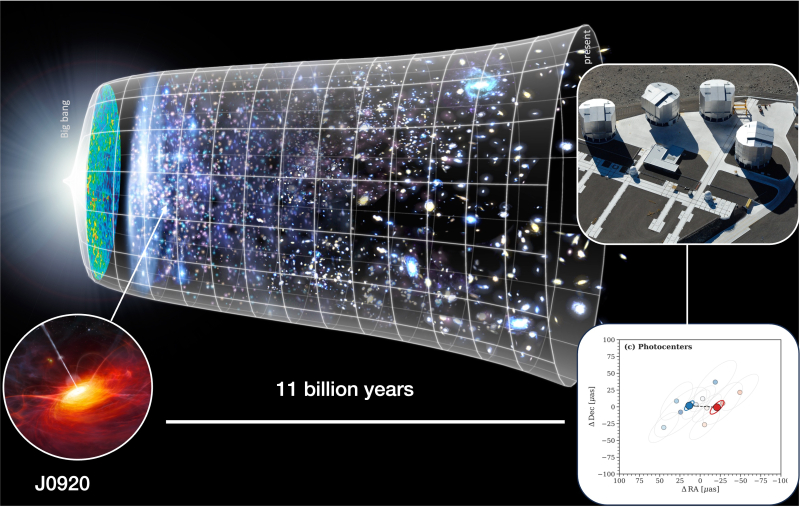 En utilisant GRAVITY+, l’équipe a pu mesurer pour la première fois de manière directe la masse d’un trou noir aux premières phases de l’évolution de l’Univers, seulement 2 milliards d’années après le Big Bang correspondant à l’époque où les galaxies ont commencé à se structurer (le "midi cosmique » ou Cosmic Noon). Ce trou noir qui se trouve au centre de la galaxie SDSS J092034.17+065718.0 a une masse mesurée de 300 millions de fois celle de notre soleil. Cette énorme masse semble pourtant plus de dix fois moins que ce que prévoyait le modèle dominant de coévolution trou noir – galaxie. Ce premier résultat qui en annonce beaucoup d’autres ouvre donc la voie à une révision profonde des mécanismes de formation des galaxies et de tout ce qu’elles contiennent.