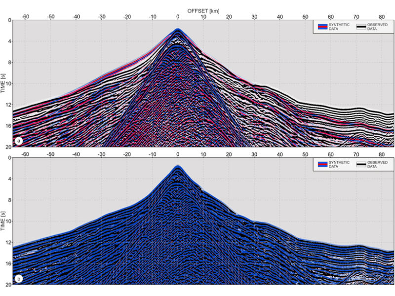 Nous avons mis en œuvre cette stratégie pour l’inversion de données de stations sous-marines enregistrées dans le secteur de la fosse de Nankai, une zone de subduction située au large du Japon. Nos résultats montrent comment, en partant d’un modèle initial simpliste variant seulement avec la profondeur, nous pouvons produire une image haute résolution du sous-sol et expliquer les données observées avec grande précision.