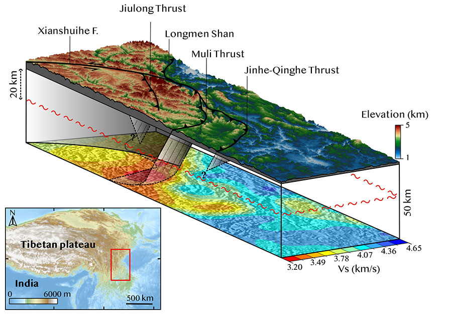 Néanmoins, ces modèles ne permettent pas de contraindre la profondeur d’enracinement de la faille, les données thermochronologiques enregistrant seulement l’évolution thermique de la croûte supérieure. Mais la corrélation entre la faille de Muli et le saut de la profondeur du moho suggère que ce chevauchement n’est pas seulement une structure dans la croûte supérieure cassante, mais se prolonge dans la croûte inférieure visqueuse (au-dessous de 20-25 km), épaississant ainsi l’ensemble de la croûte au cours de la collision.