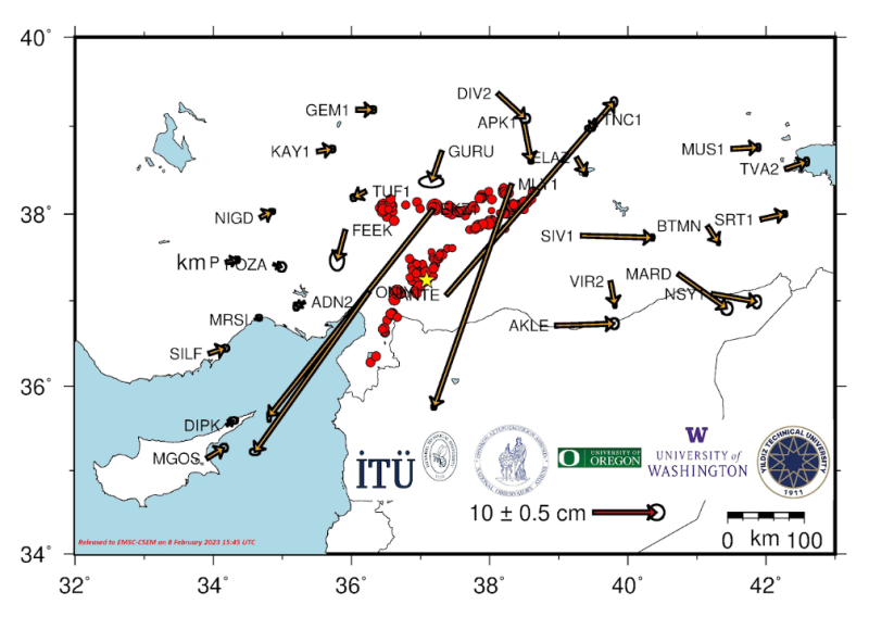 Les données GNSS(Global Navigation Satellite System, ou Système Global de Navigation Satellite en français) sont acquises à partir de récepteur au sol et permettent de voir et de calculer les vitesses des déplacements du sol, mais aussi des déformations de la Terre allant de quelques minutes à des dizaines d’années. Dans le cas du séisme en Turquie, la « charte des catastrophes naturelles » a été déclenchée, ce qui a permis aux équipes scientifiques d’avoir accès aux données satellitaires de différentes agences spatiales rapidement. Le GNSS n’est pas la seule technique utilisée, l’étude de la tectonique active et de la paléosismologie [12] sont essentielles pour renseigner sur l’activité à plus long terme des failles. C’est également grâce à cette pluridisciplinarité de mesures que les scientifiques identifient les régions du monde à fort risque sismique.