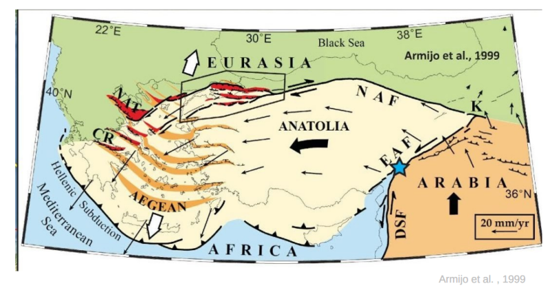 La Turquie, correspondant en majeur partie à la plaque anatolienne, est située entre trois plaques tectoniques : la plaque eurasienne, la plaque africaine, et la plaque arabique. Elle est délimitée à l’est par la faille [9] principale Est-anatolienne (EAF) et au nord par la faille principale Nord Anatolienne (NAF) qui a rompu sur plus de 900 km par une série de séismes en cascade d’est en ouest entre 1939 et 1999.